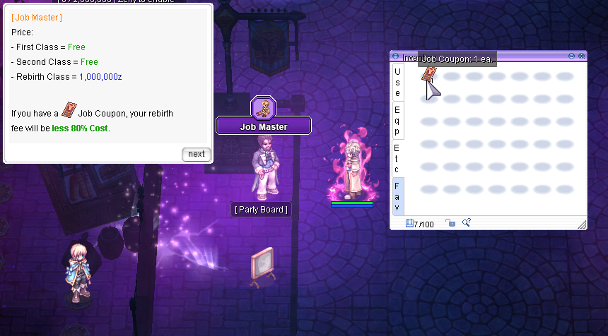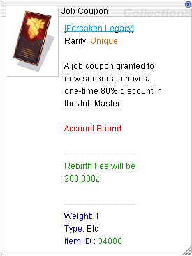 On the [recent update](https://forsaken-legacy-ragnarok-online.gitbook.io/flwiki/archive/previous-changelogs/changelogs-1.6), you can now use a **Job Coupon** to lessen the cost of rebirthing by 80% of the original zeny cost.